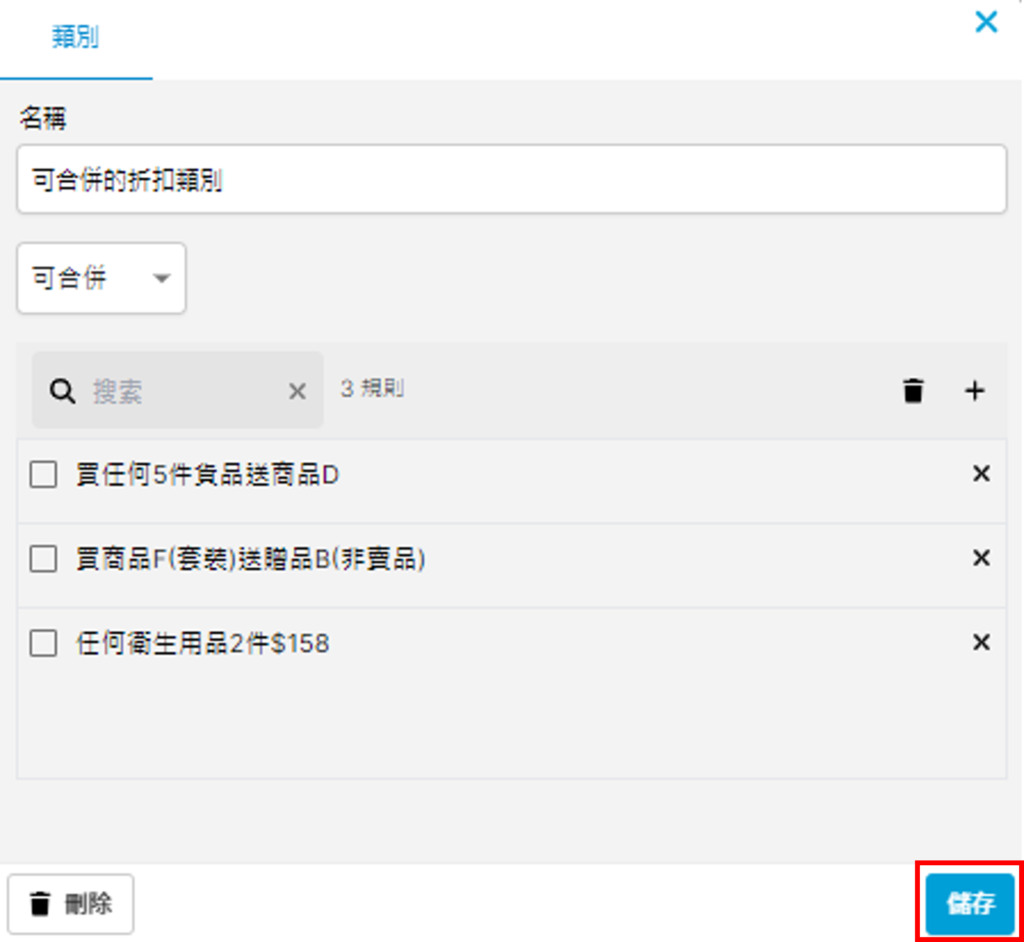 當您的折扣規則有其中兩條是可以同時使用,即為「可合併」折扣類型;