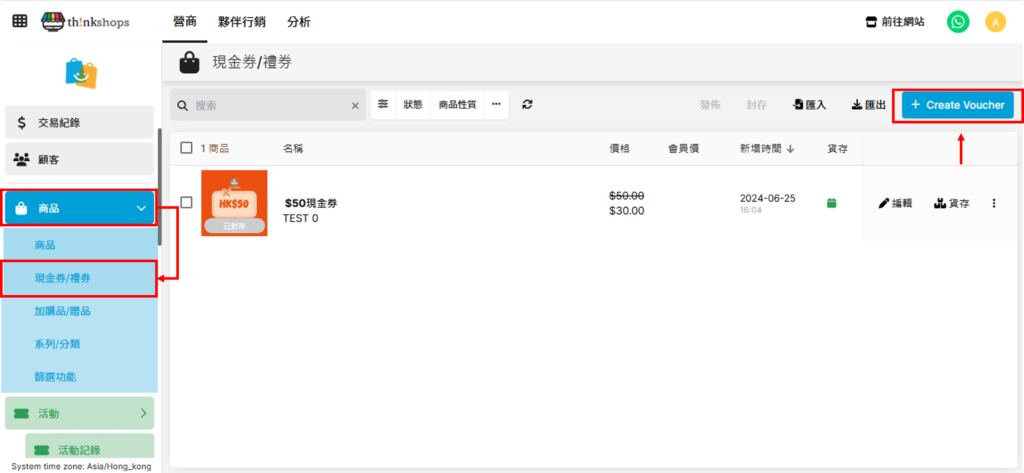 於後台主選單點擊「商品」下的「現金券/ 禮券」,然後點擊「+Create Voucher」