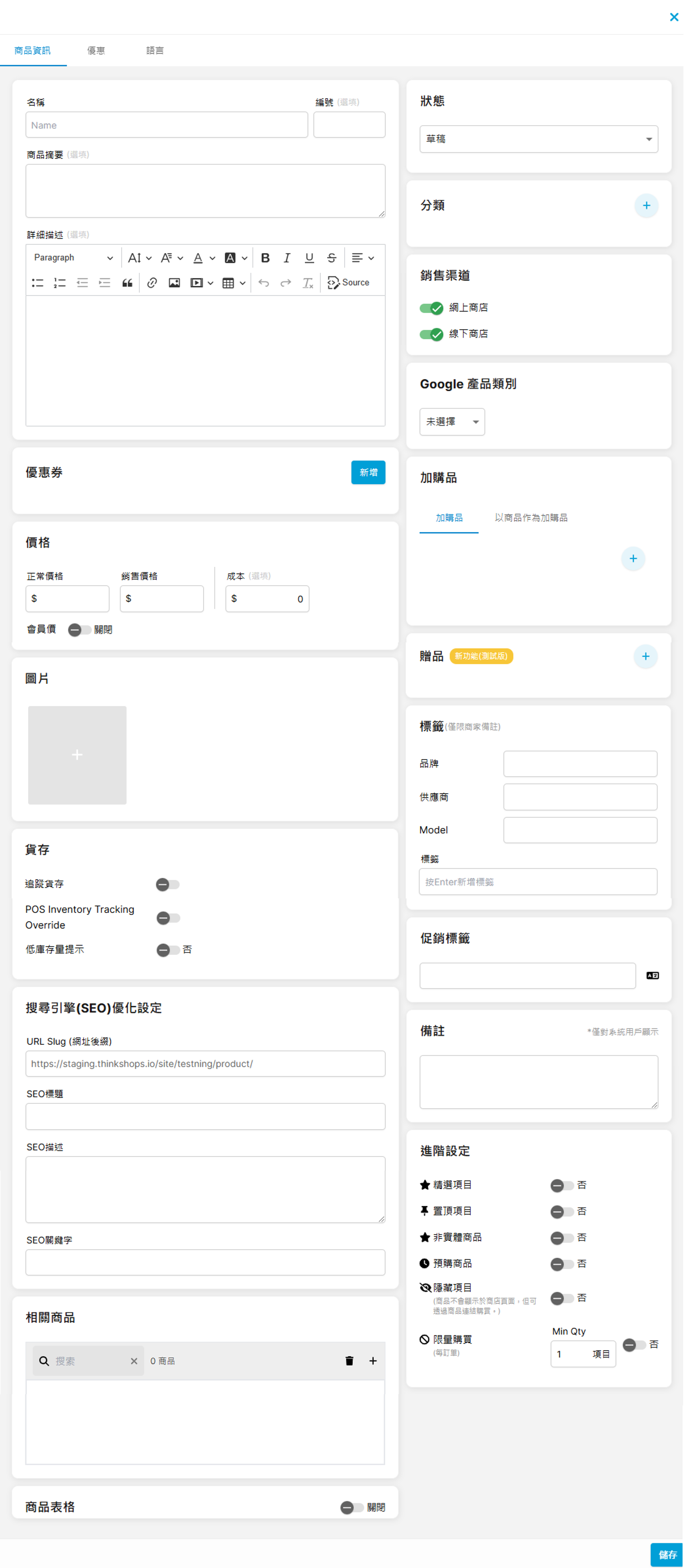 12. 促銷標籤 您可為商品加入促銷標籤,只需於空格內加入促銷文字 13. 搜尋引擎(SEO)優化設定 透過設定「網路搜尋引擎最佳化(SEO)」,可以幫助您的商店提升在搜尋結果的排名,令更多人透過搜尋找到您的商店及出售的商品。我們可以透過設定 URL網址、SEO標題、SEO描述和SEO關鍵字來達成優化。