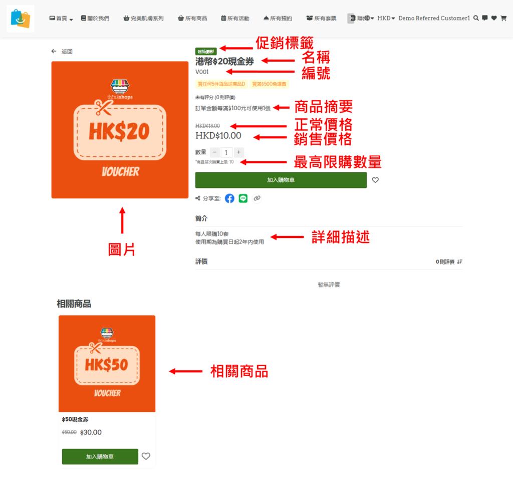 • 複製商品詳情:自動複製該現金券/ 禮券的頁面連結、名稱及詳細描述
