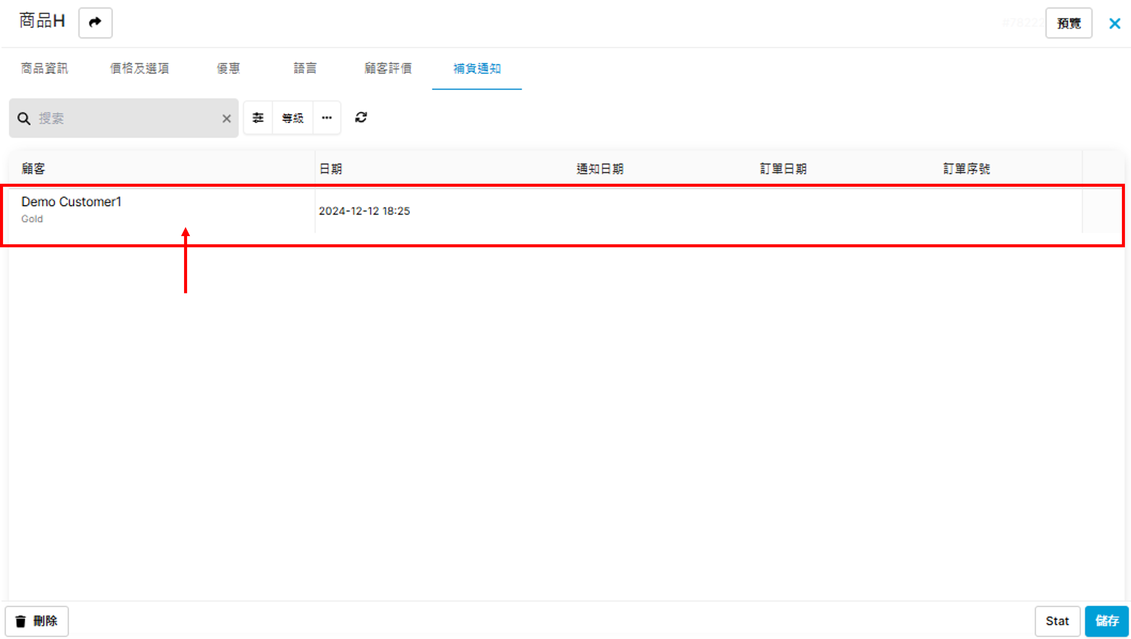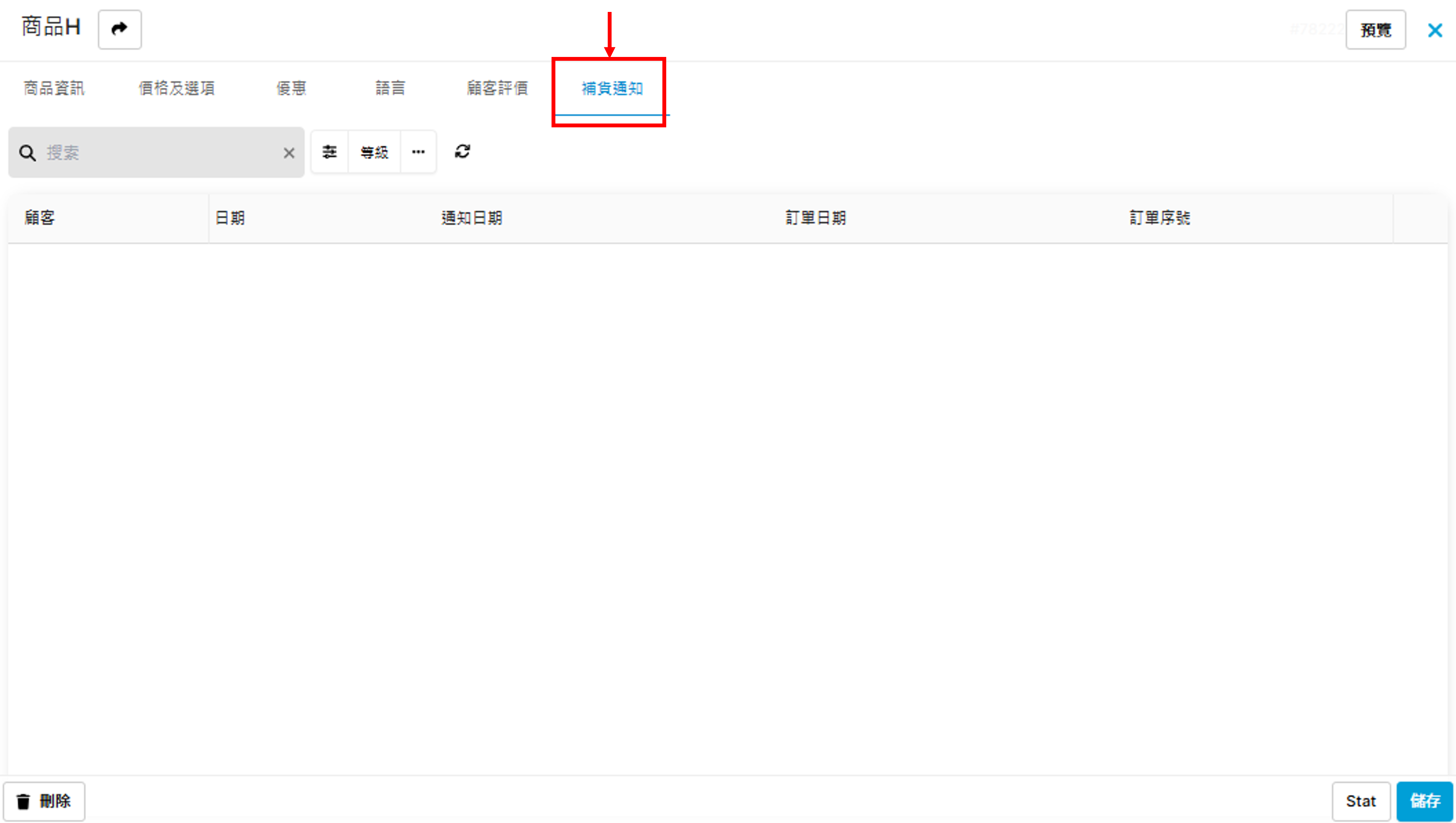 商品管理補貨通知一、新增商品資訊 補貨通知 如您有開啟補貨通知功能,您可於「補貨通知」分頁統一查看要求補貨通知的會員列表。(開啟補貨通知功能的方法請參考本指引「設定會員>會員制度>設定」中的解說) 位置:點擊「補貨通知」分頁 當客人點擊開啟補貨通知後,您便可於這個列表看到所有需通知的顧客,點擊顧客的名稱便可查看顧客的資料。