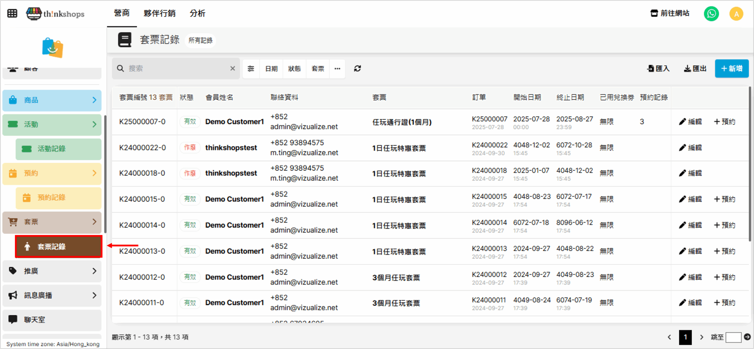 您可統一管理及翻查套票購買紀錄。 進入位置:於後台左方主選單進入「套票」下的「套票紀錄」: