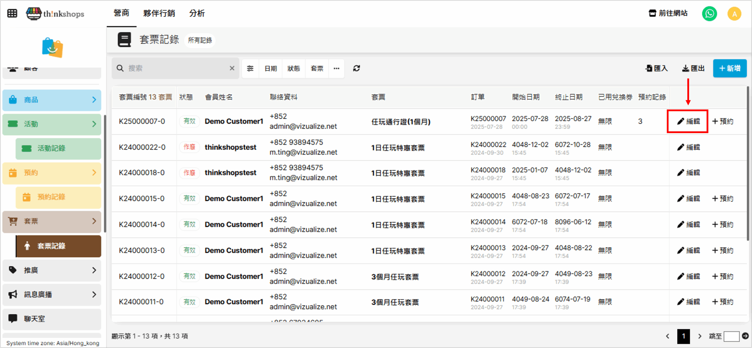 您可隨時翻查及修改套票購買紀錄,進入「套票紀錄」後,搜尋相關的套票購買紀錄,點擊最右方的「編輯」: