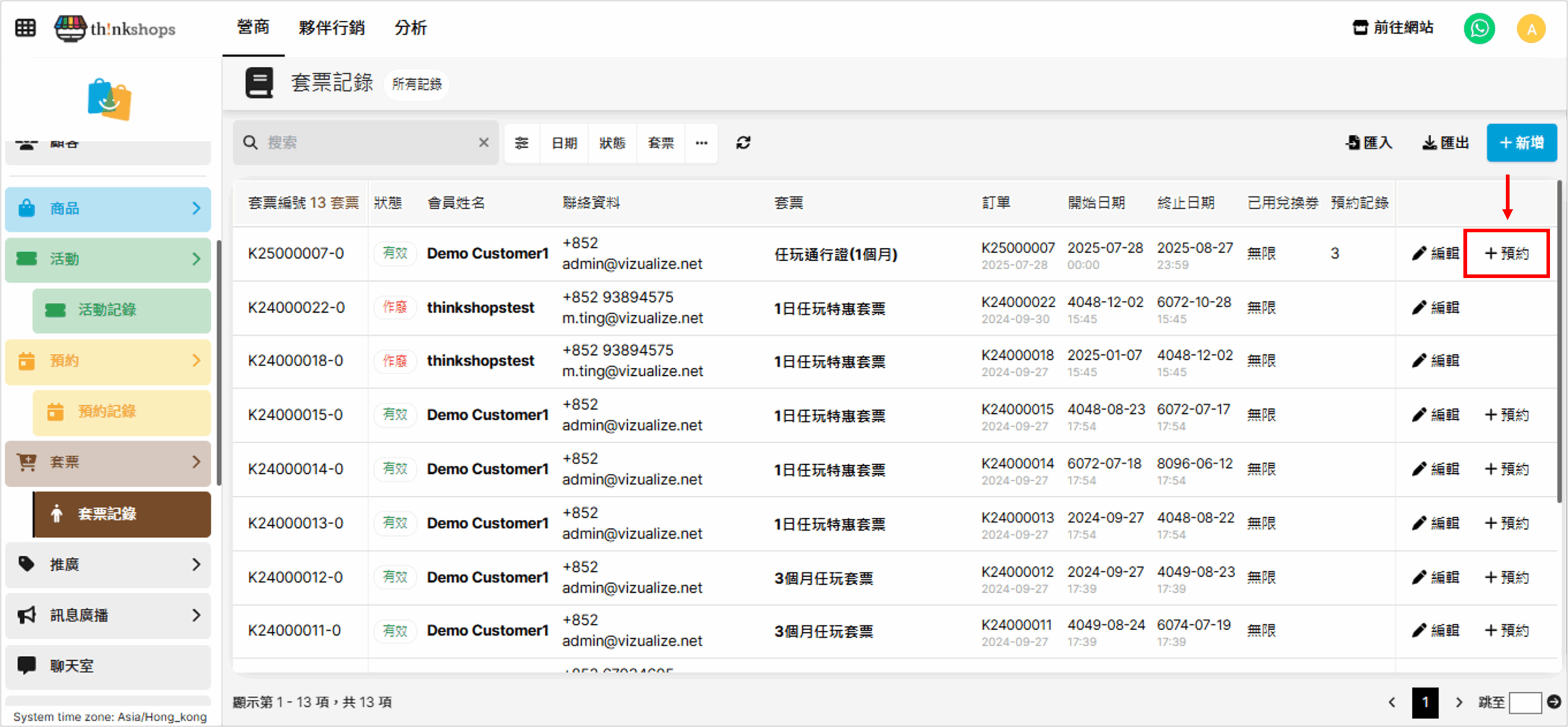 您可於後台為套票加入預約,先點擊要使用的套票右方的「+預約」: