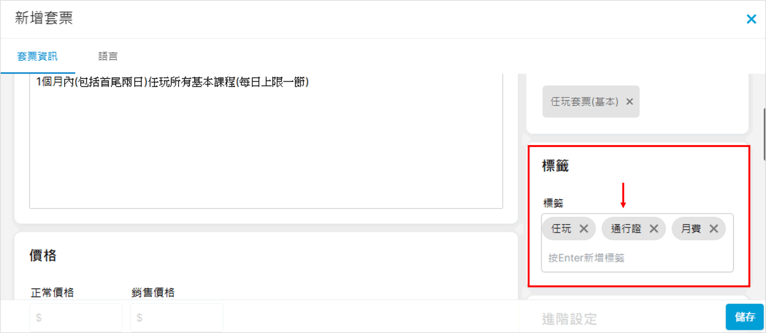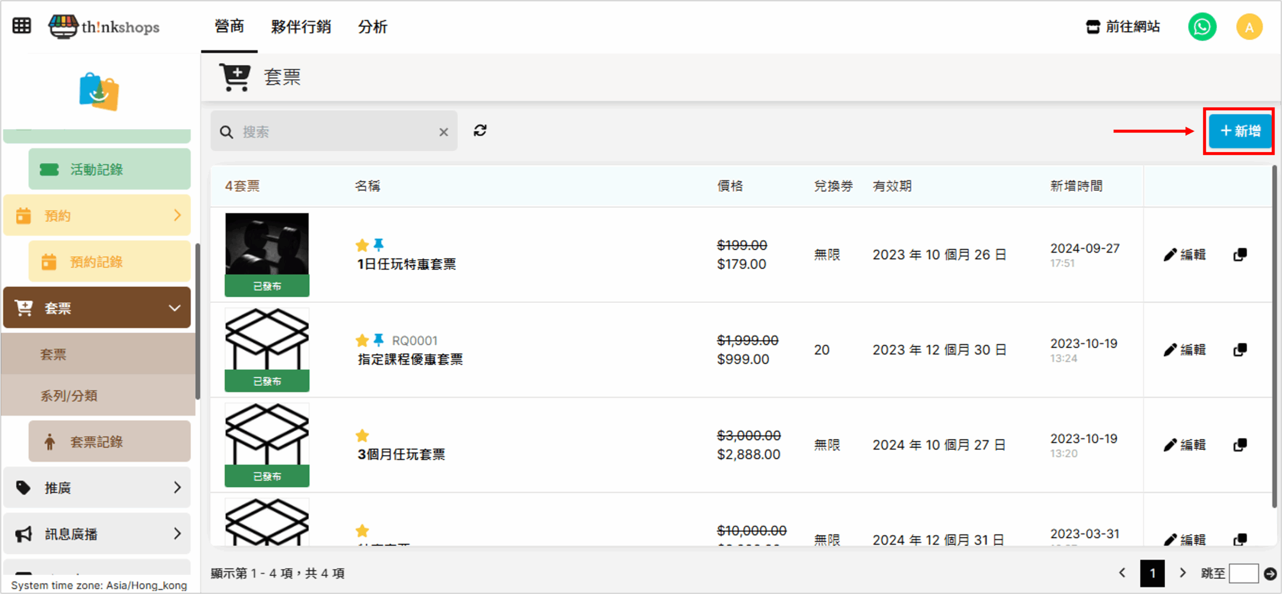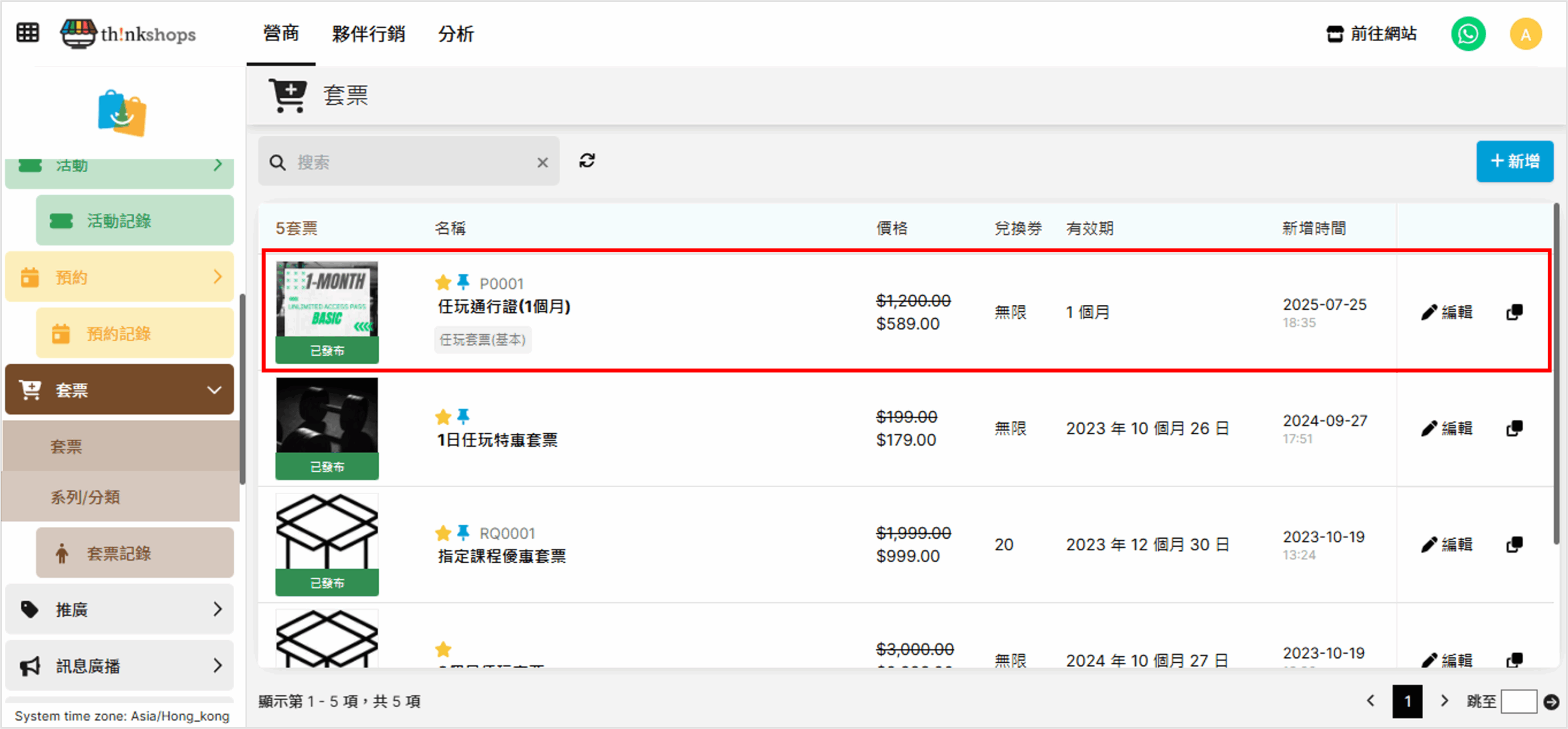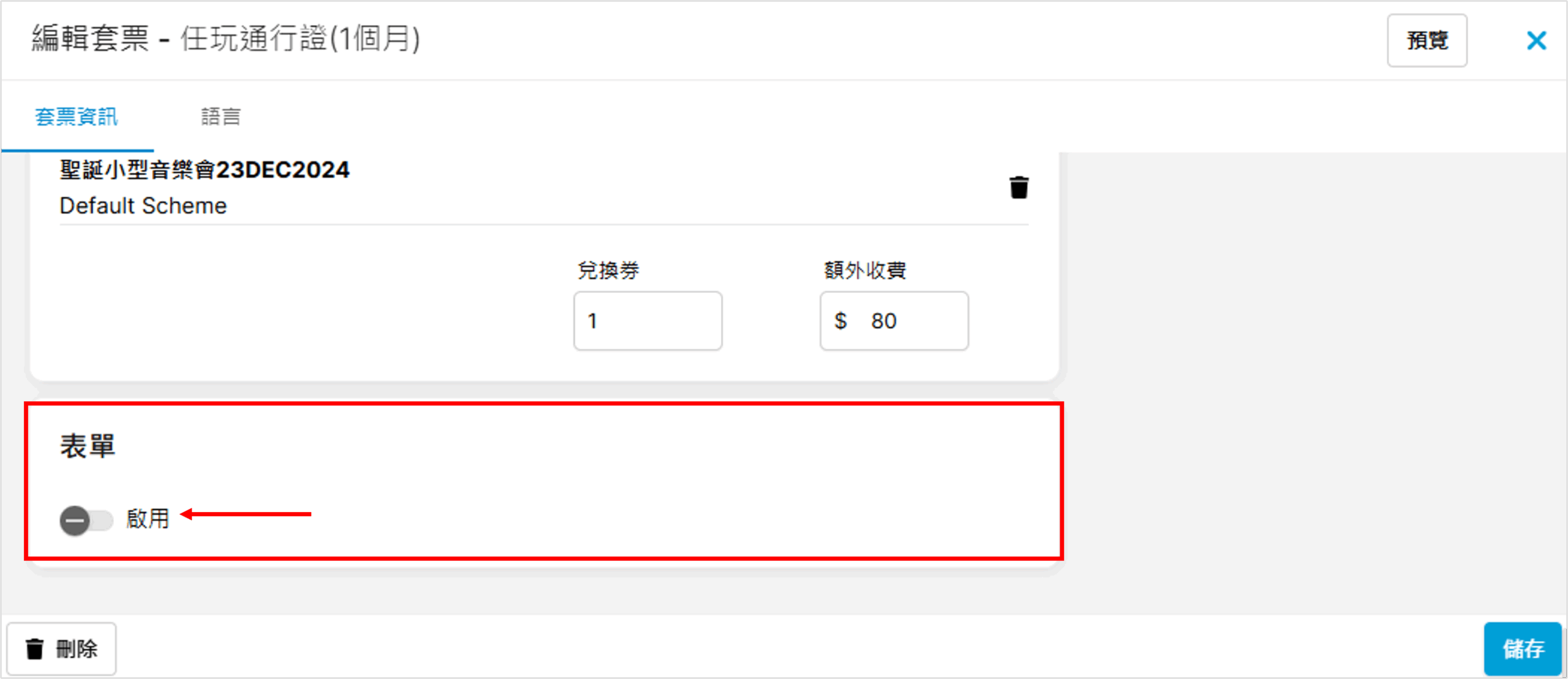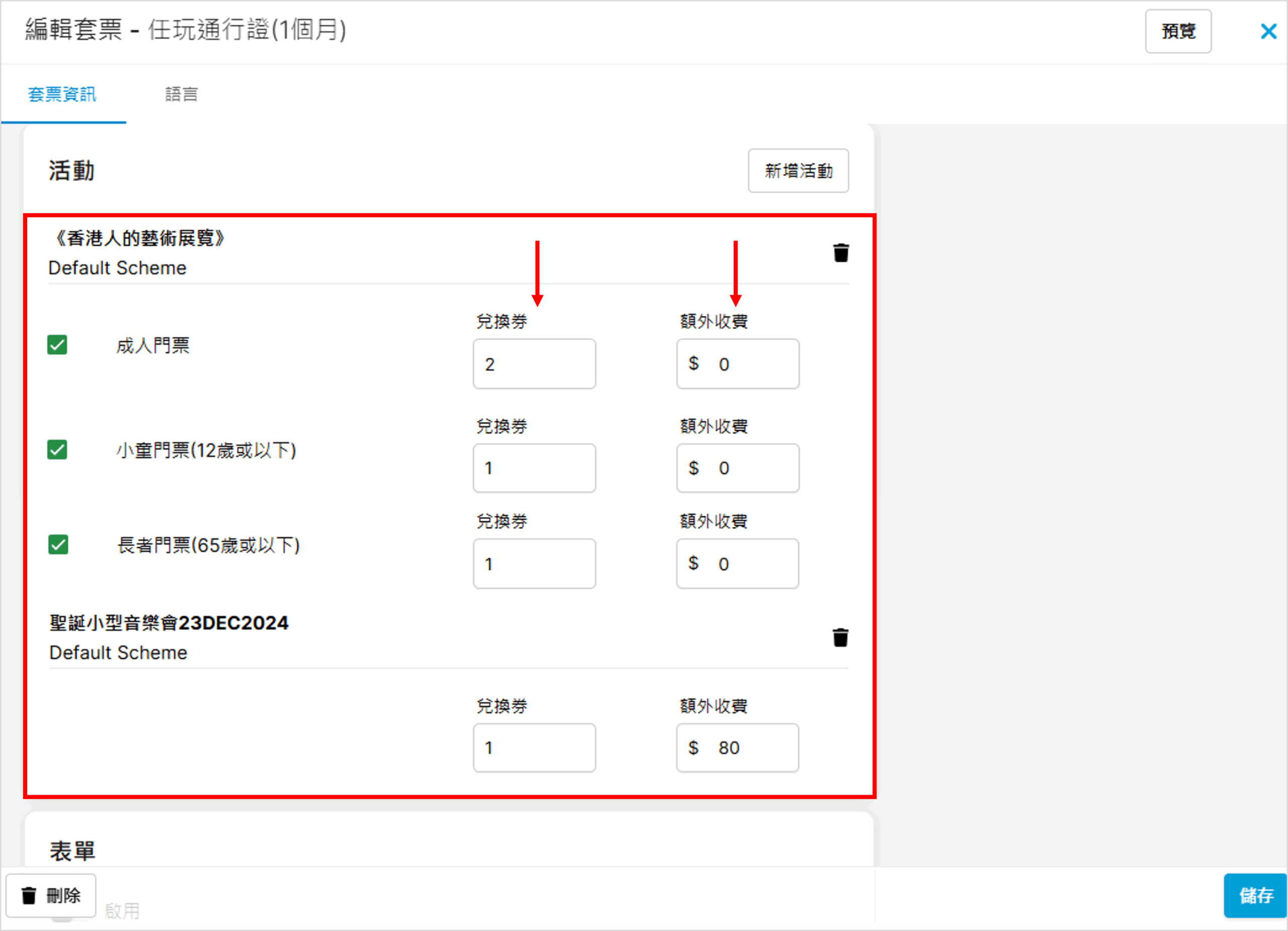 成功儲存後便會新增套票至項目欄上: