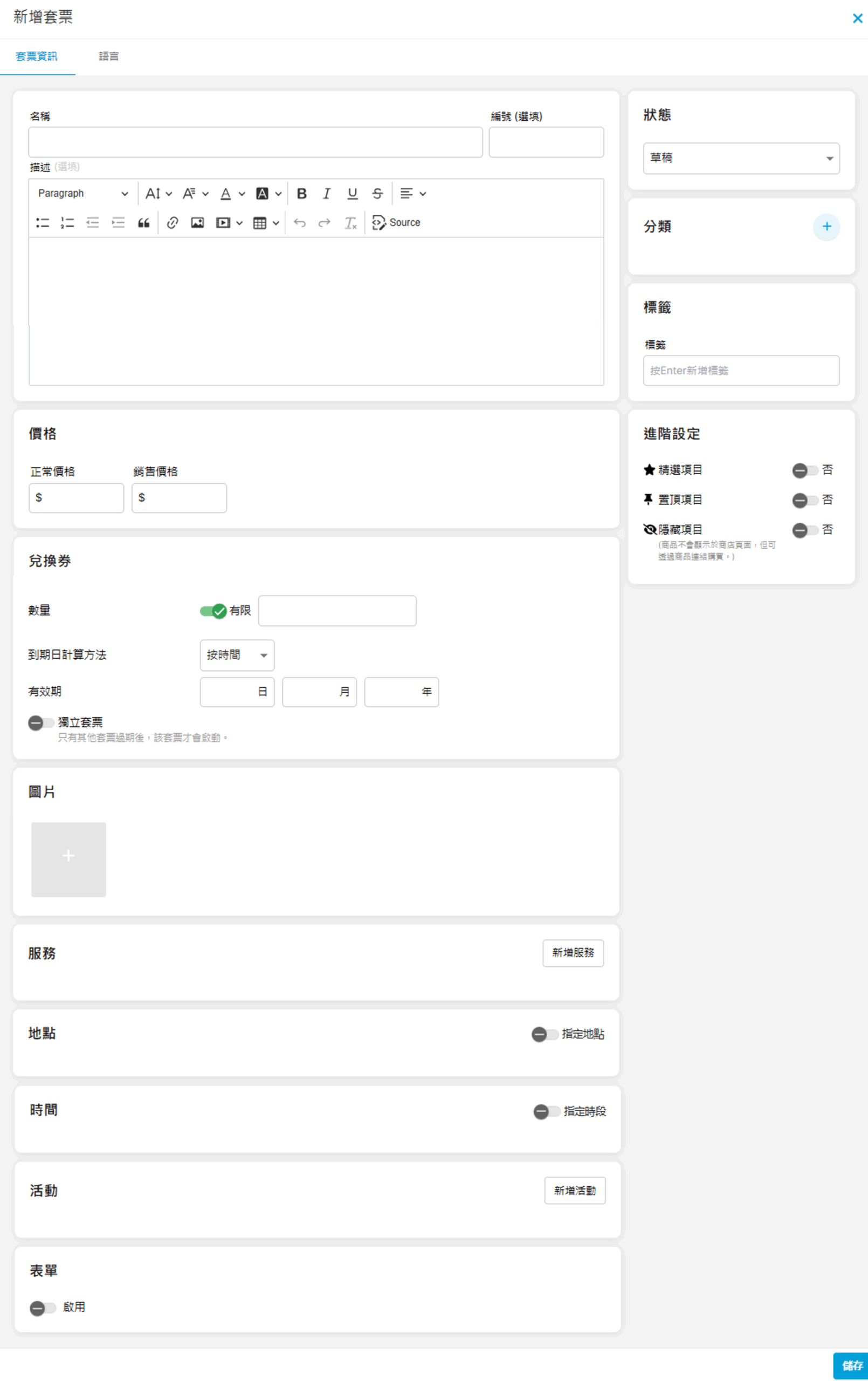 • 數量:套票是否包含有限或無限的兌換券數量?(例如1個月任玩套票可選「無限」;買十送二套票可選「有限」),如有限數量,請輸入數量於空格