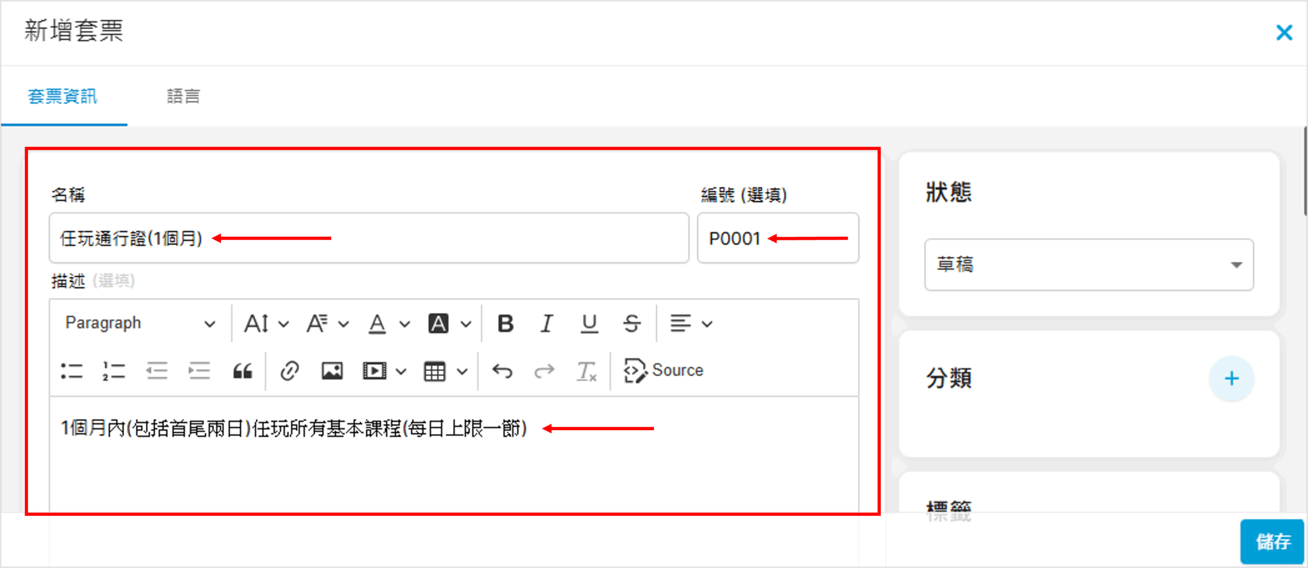 1. 輸入套票的名稱、編碼(選填)及描述(選填)