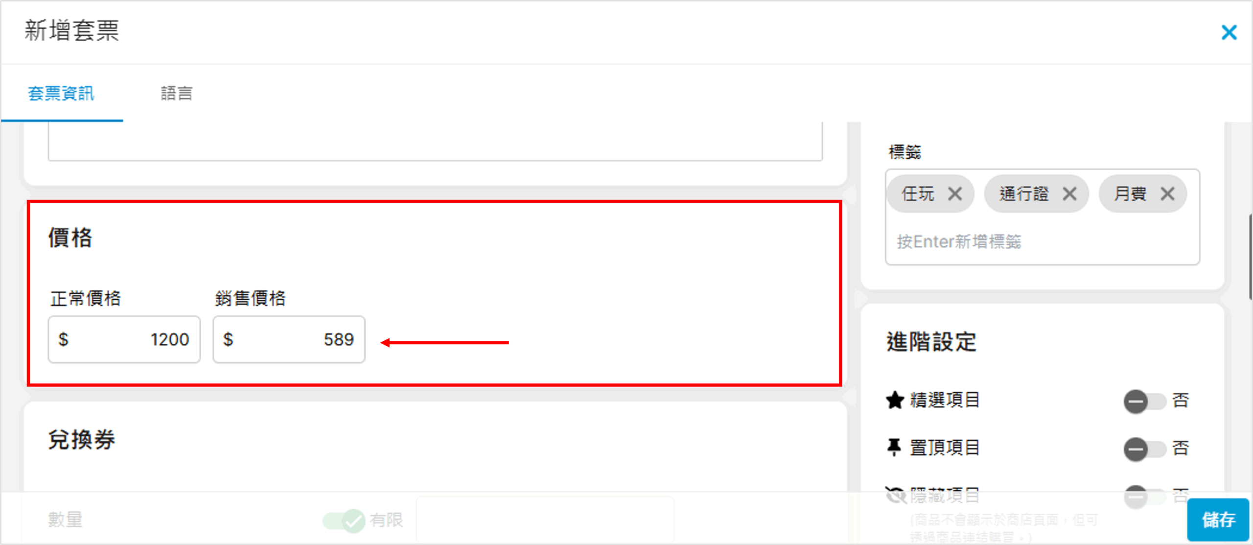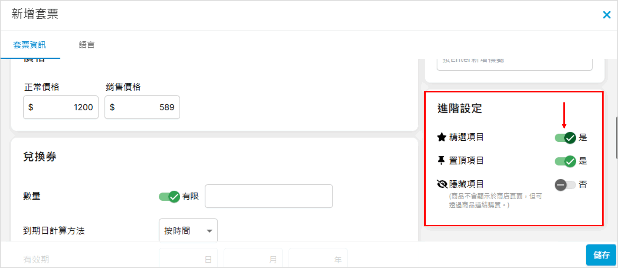 • 置頂項目:是否將此套票長期置頂?