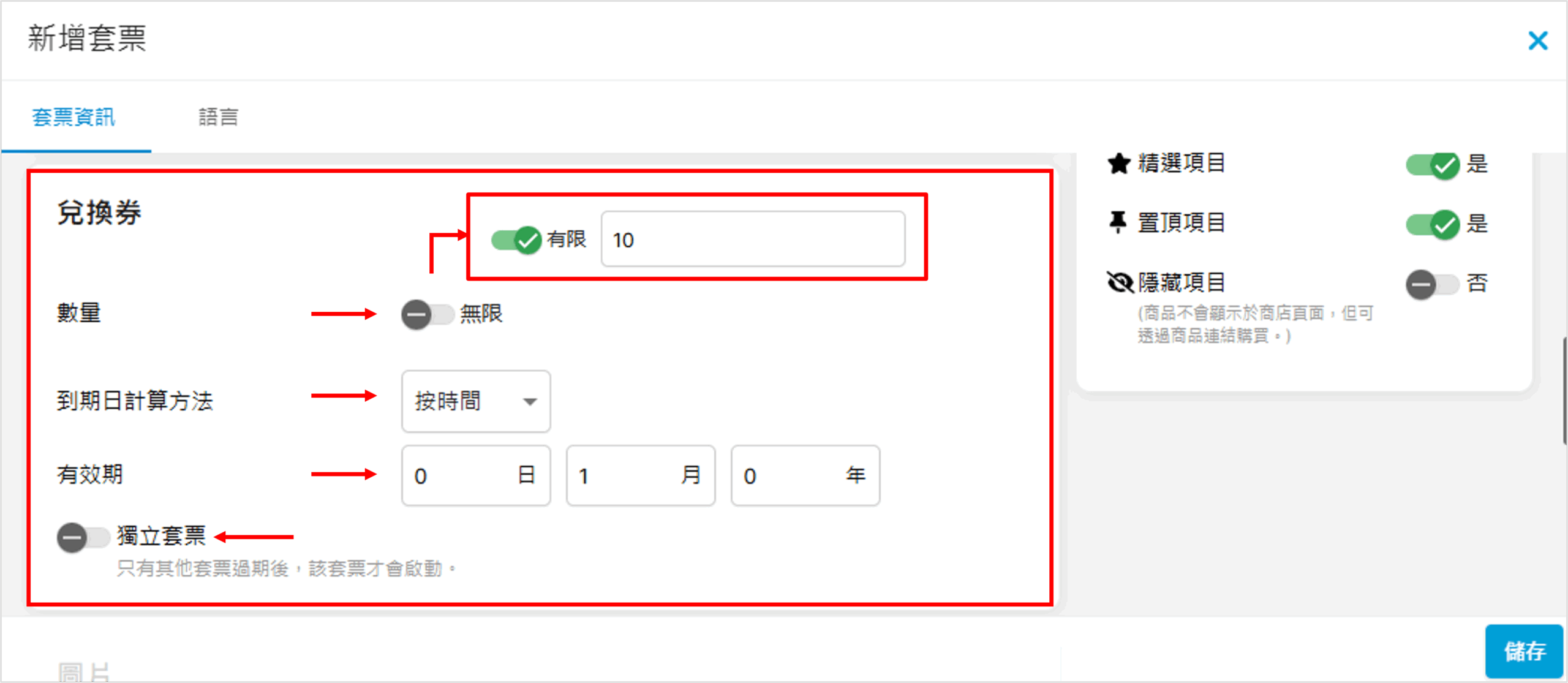 • 精選項目:是否將此套票設為精選商品(打星)?