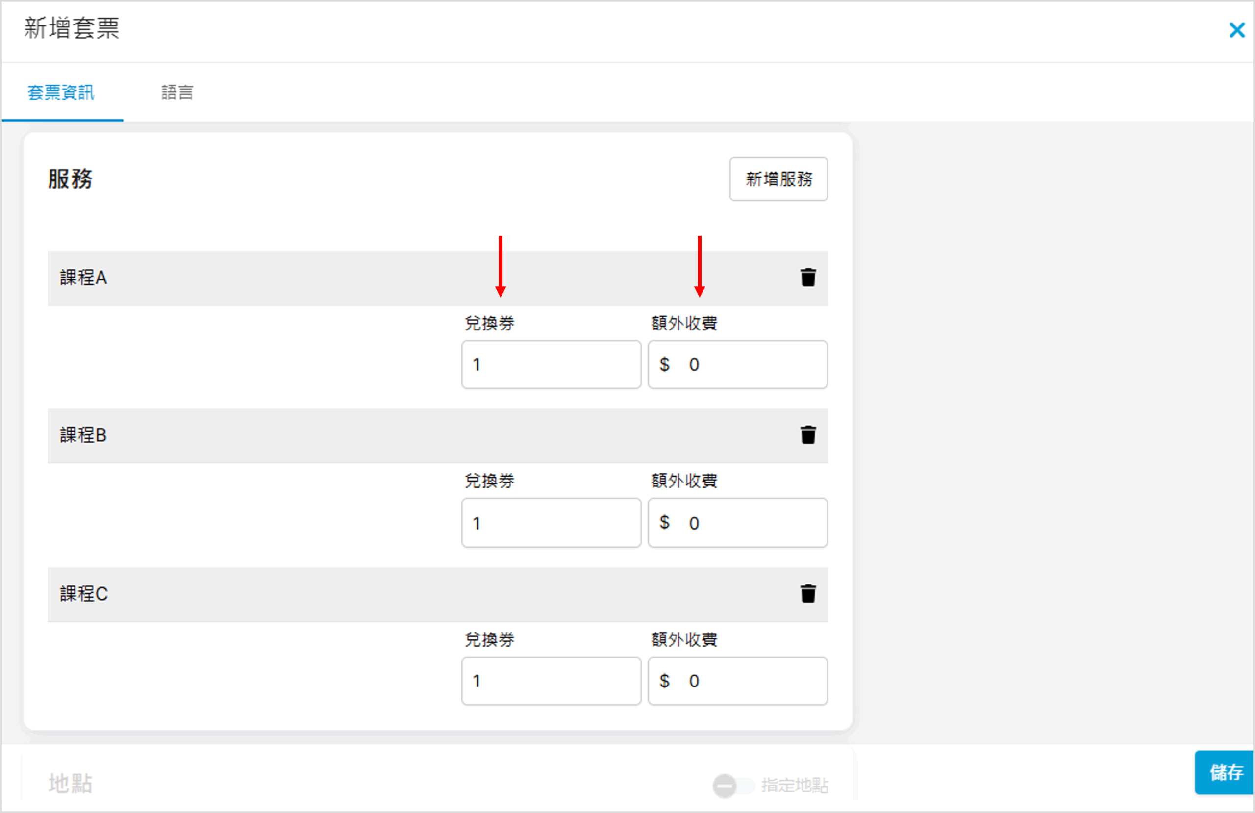 加入服務後,輸入各個服務會使用到的兌換券數量及額外收費(如有):