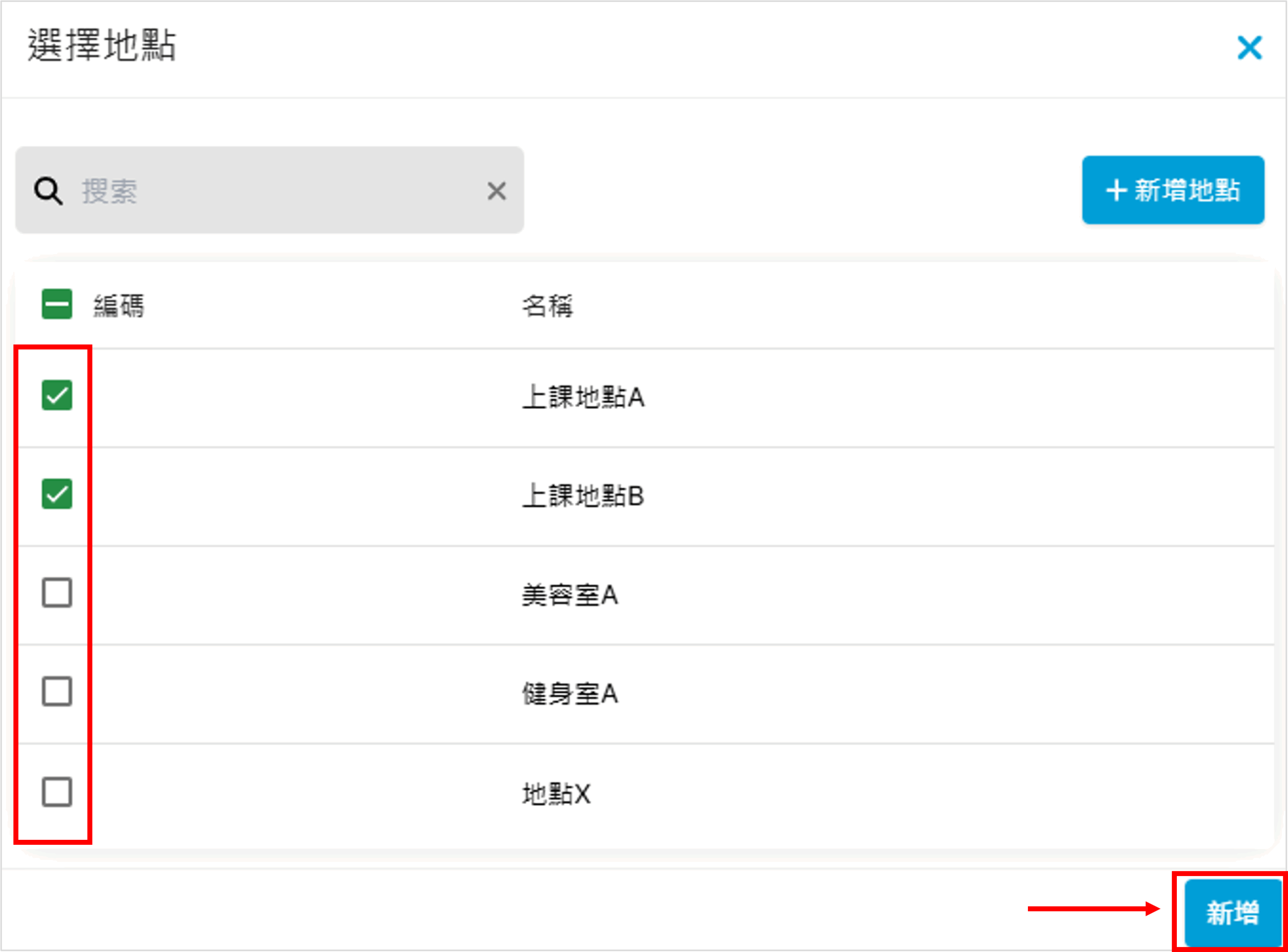 選擇可使用的地點,再按「新增」:
