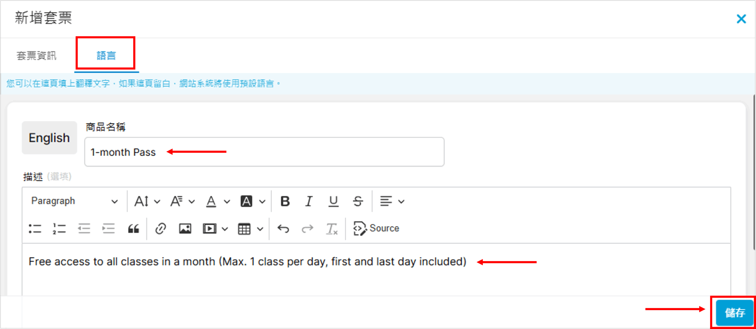 如您為網站設定了其他語言(例如英語及簡體中文),請按至「語言」分頁並輸入翻譯,完成後按「儲存」: