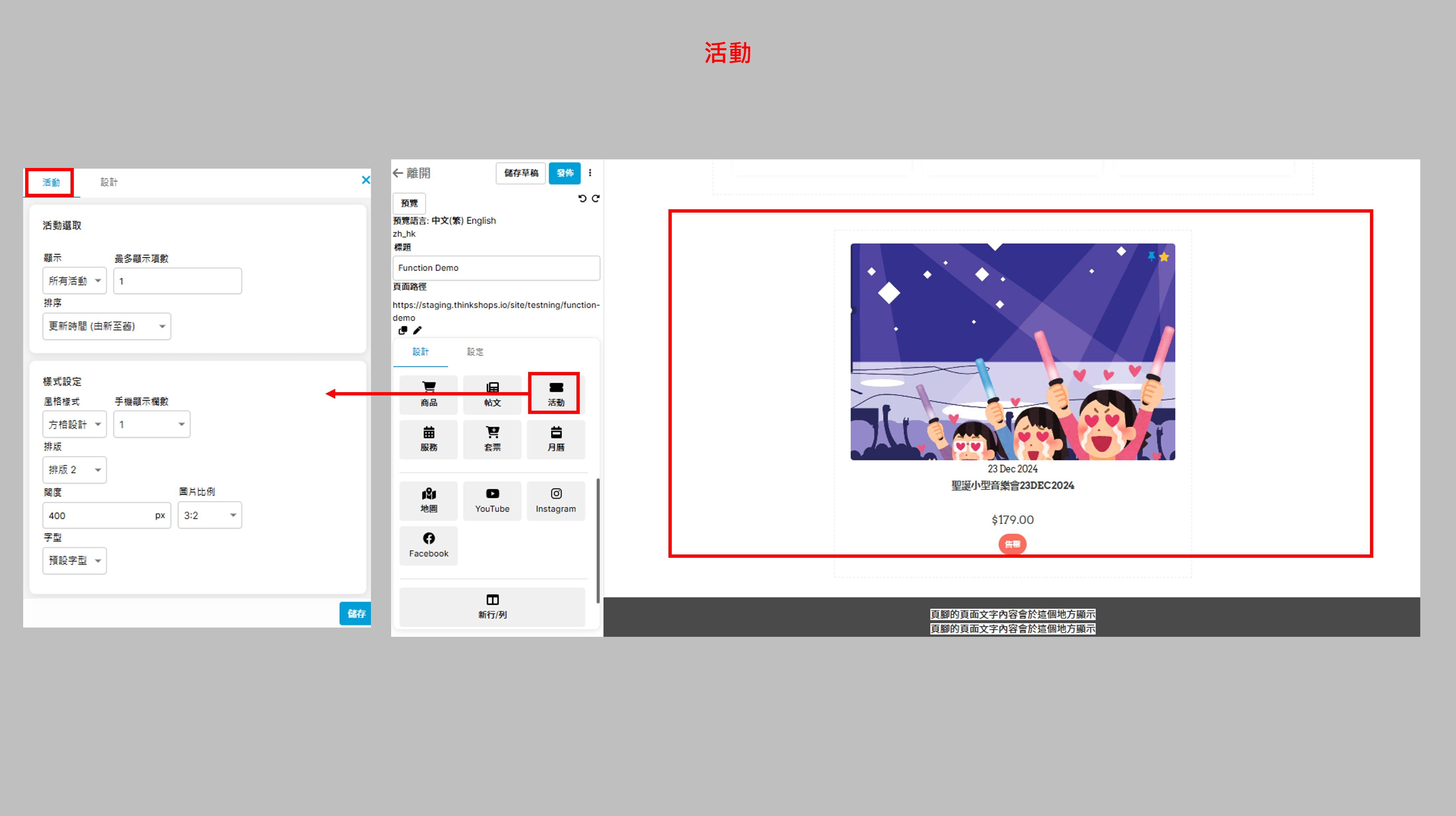 實用元素 三、活動 您可於頁面中加入活動作銷售。 活動選取 顯示:選擇顯示「所有活動」、「精選項目」或「特定分類」中的活動 最多顯示項數:設定最多顯示的活動數目,如5個 排序:活動排序原則,例如按活動的名稱或價格 (註: 要設定「活動」,請在後台主選單點選「活動」,如您想編輯或增加活動,可以瀏覽_活動設定_ 。) 樣式設定 風格樣式:範例如下 排版:範例如下 闊度:每個活動欄的闊度(px) 圖片比例:活動圖片的比例,上圖範例是3:2 字型:活動欄的文字字款 完成後按儲存。