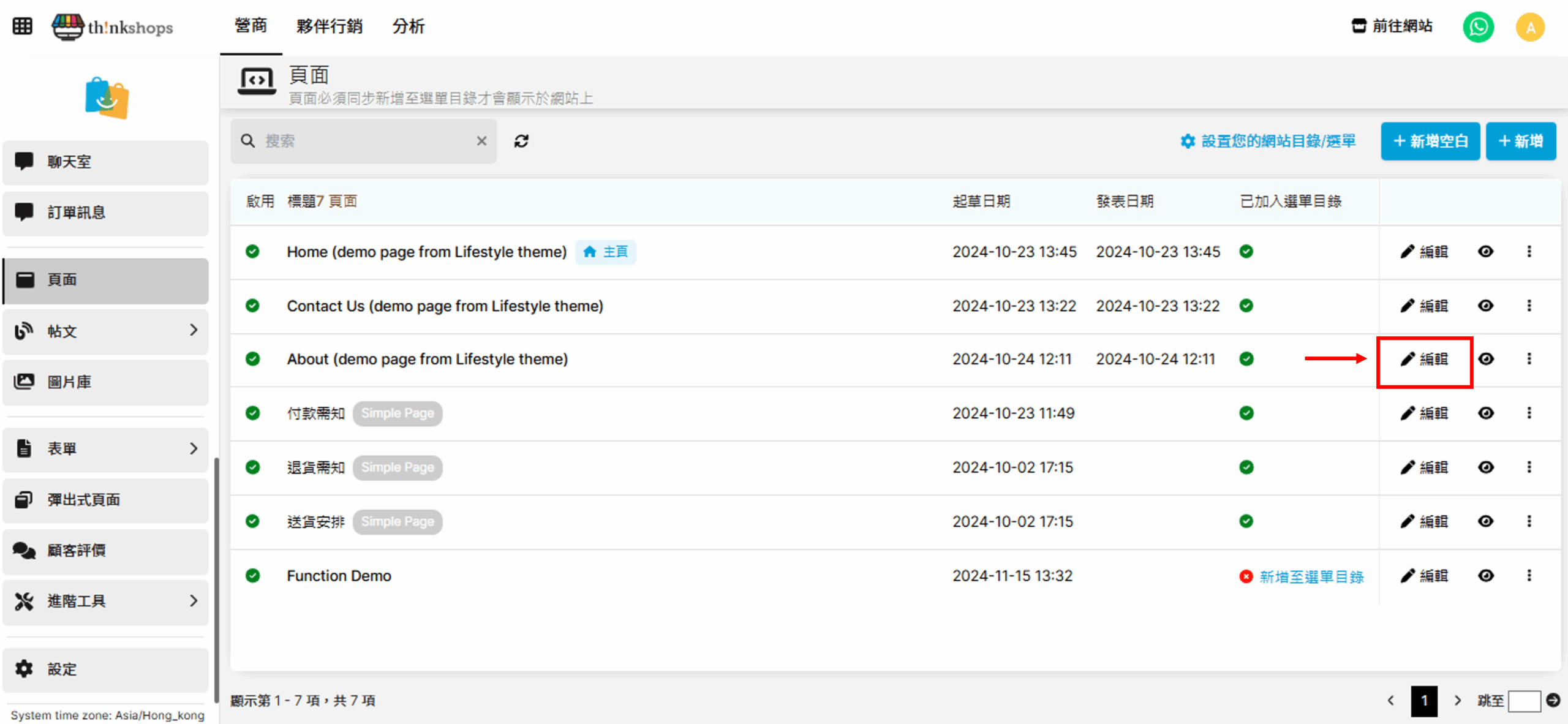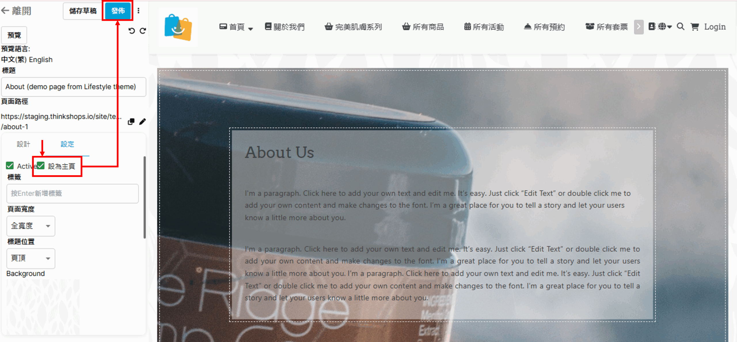 頁面設定 更改主頁 您可隨意更改其他頁面為網站主頁。 先於後台左方選單進入「頁面」: 選擇需要設定為主頁的頁面,並點擊右方的「編輯」: 進入到頁面的編輯畫面後,點擊「設定」分頁: 勾選「設為主頁」,然後按「發佈」即可更改主頁: