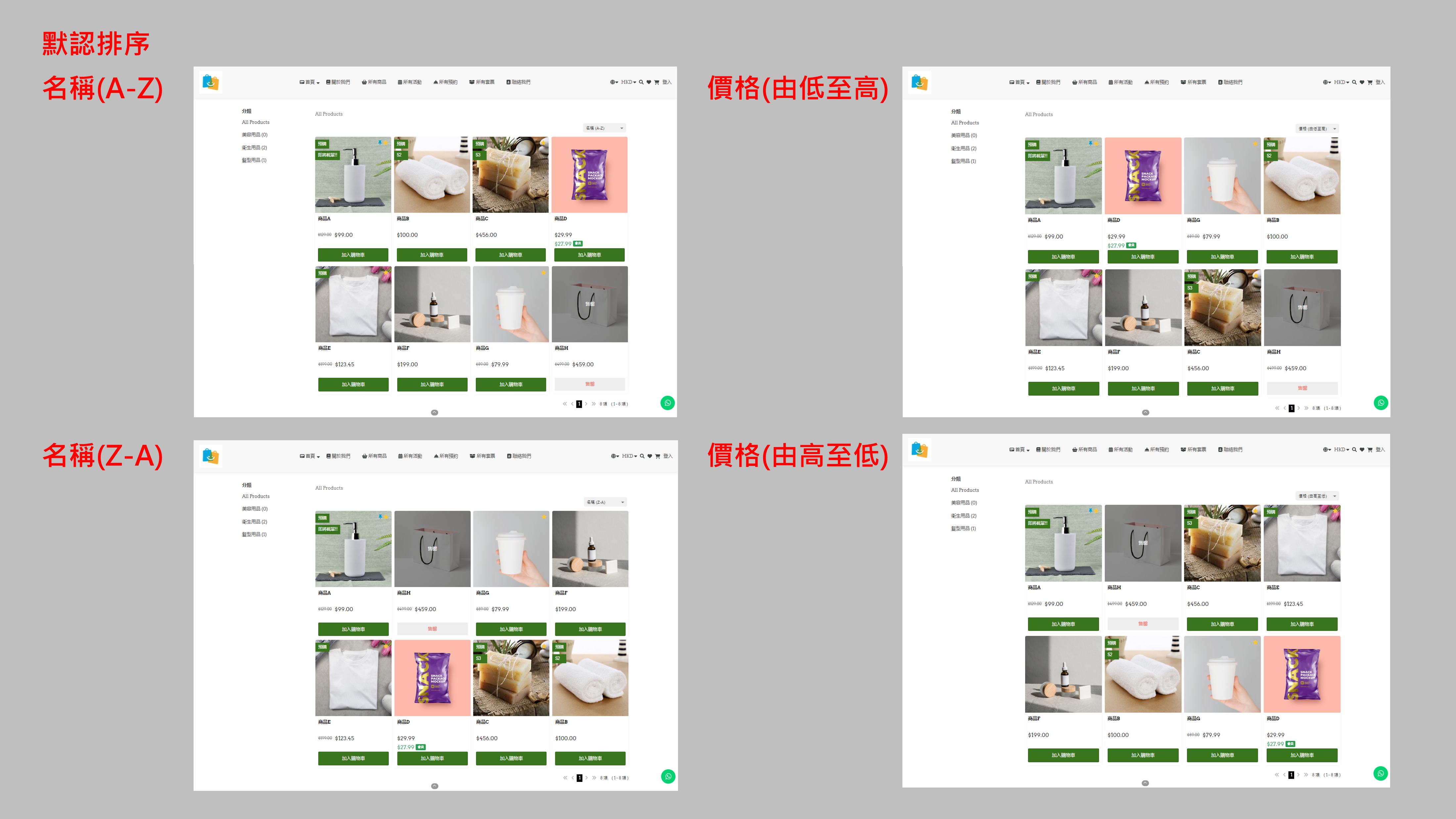 • 默認排序:商品於分類頁面的排列次序,包括按名稱(A-Z)、名稱(Z-A)、價格(由低至高)及價格(由高至低)。效果如下圖,由於商品A已設為置頂商品,所以排序不論設定為哪個都是最優先顯示。