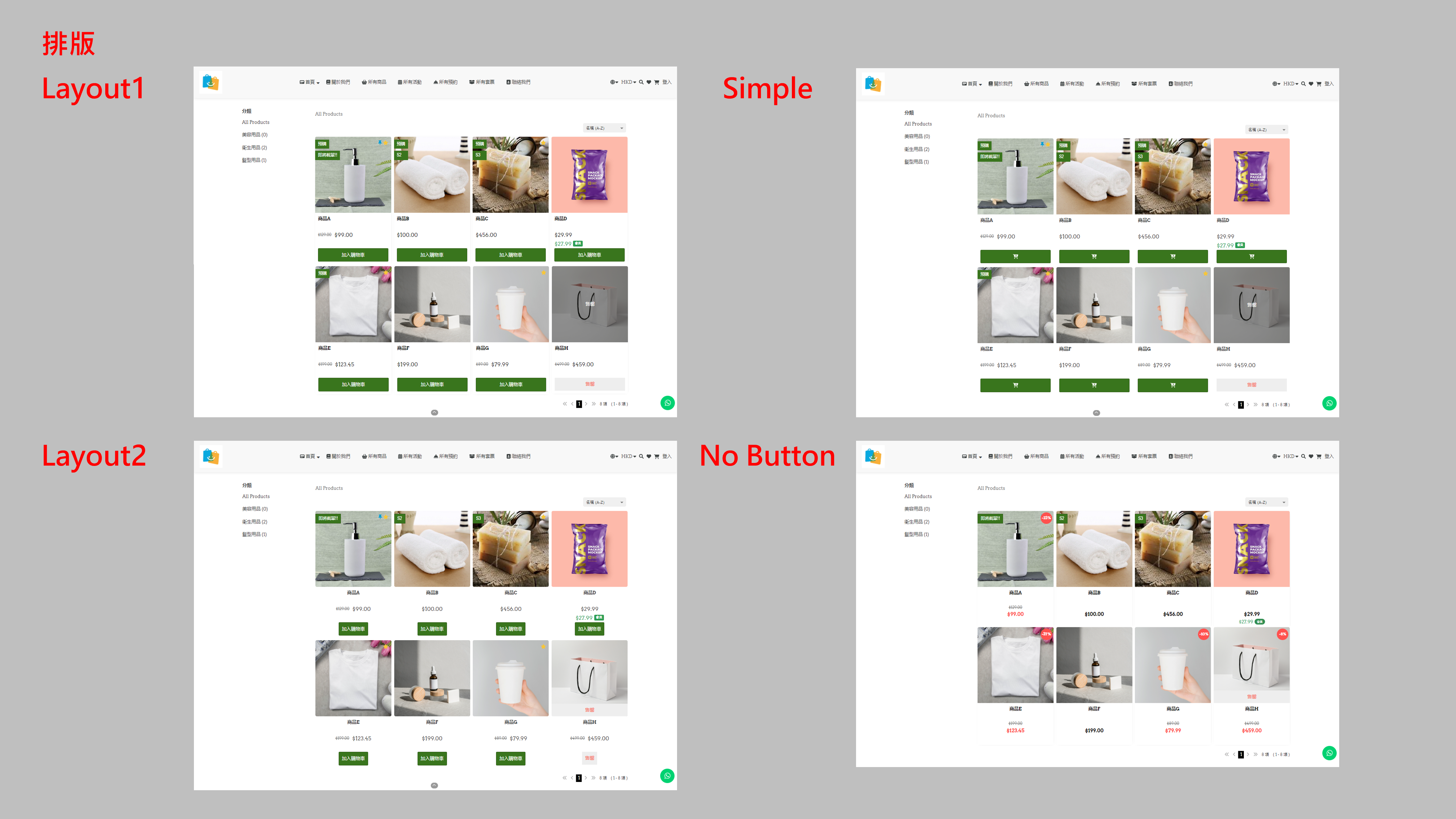 • 排版:每件商品格的外觀,這裡暫時提供了4個樣式供選擇,包括Layout1、Layout2、Simple及No Button,樣式比較如下: