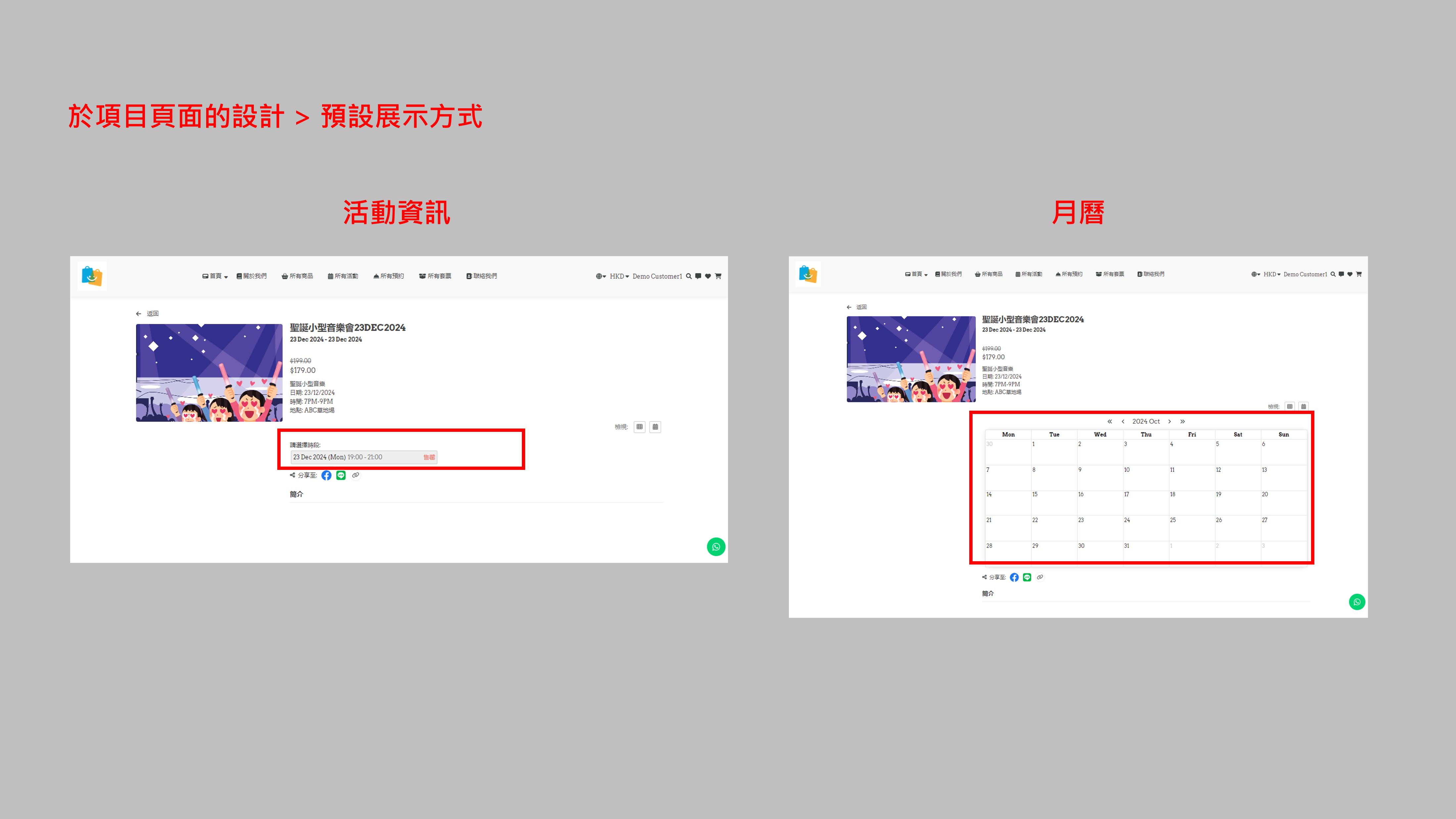 • 預設展示方式:您可選擇預設以「活動資訊」或「月曆」顯示活動時段