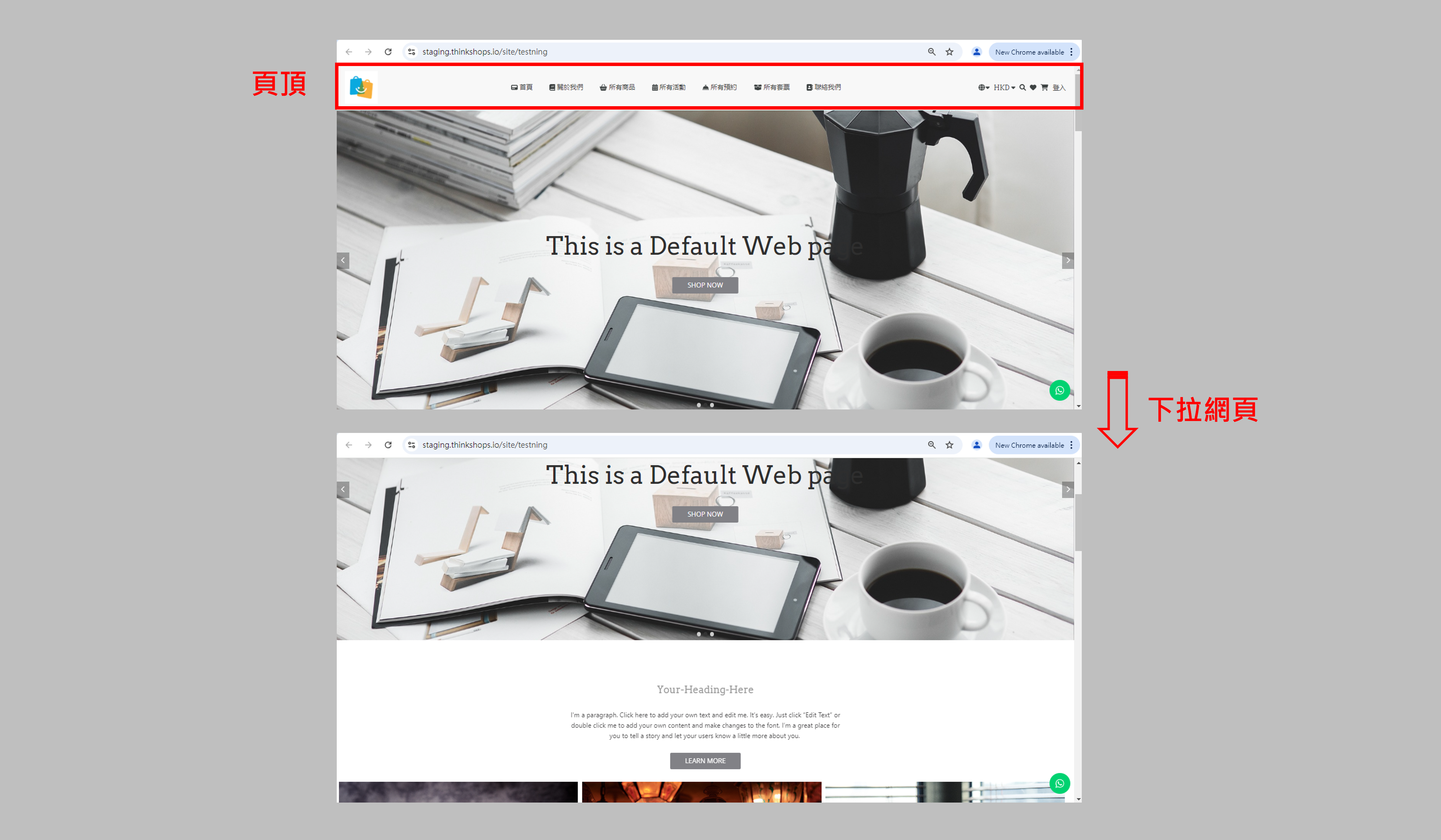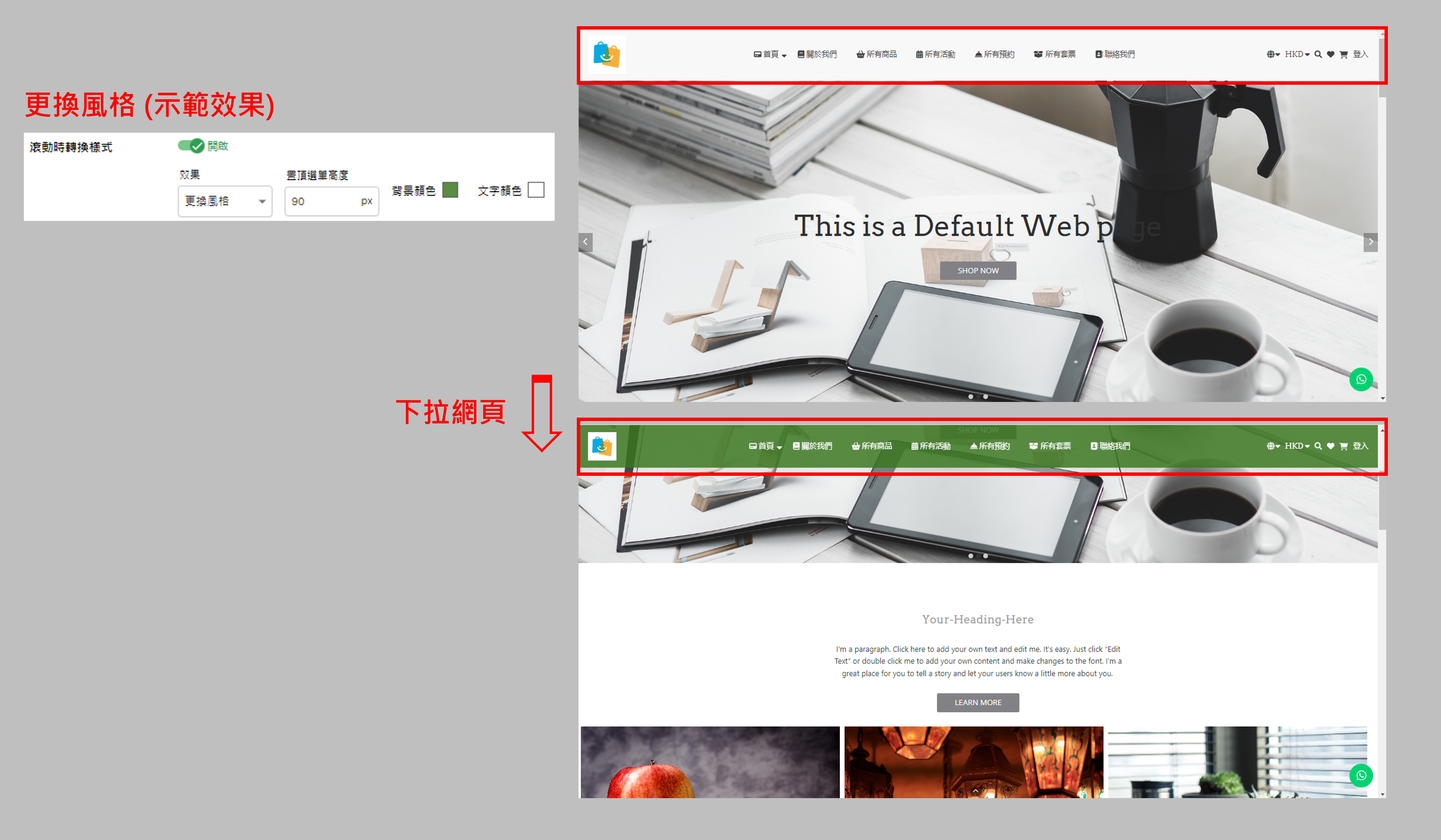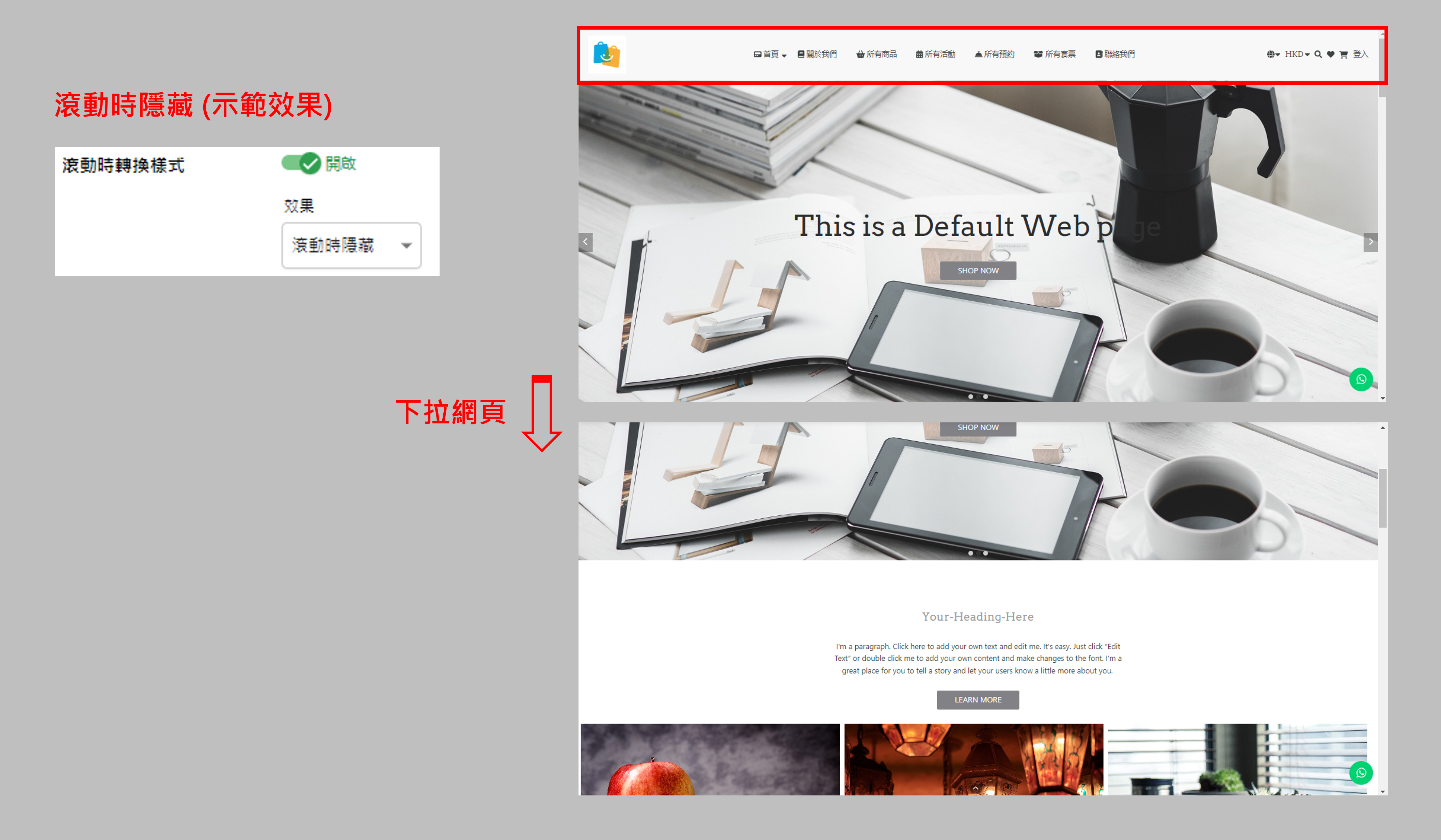 • 滾動時隱藏:下拉網頁時置頂選單將隱藏不見。(如上圖)