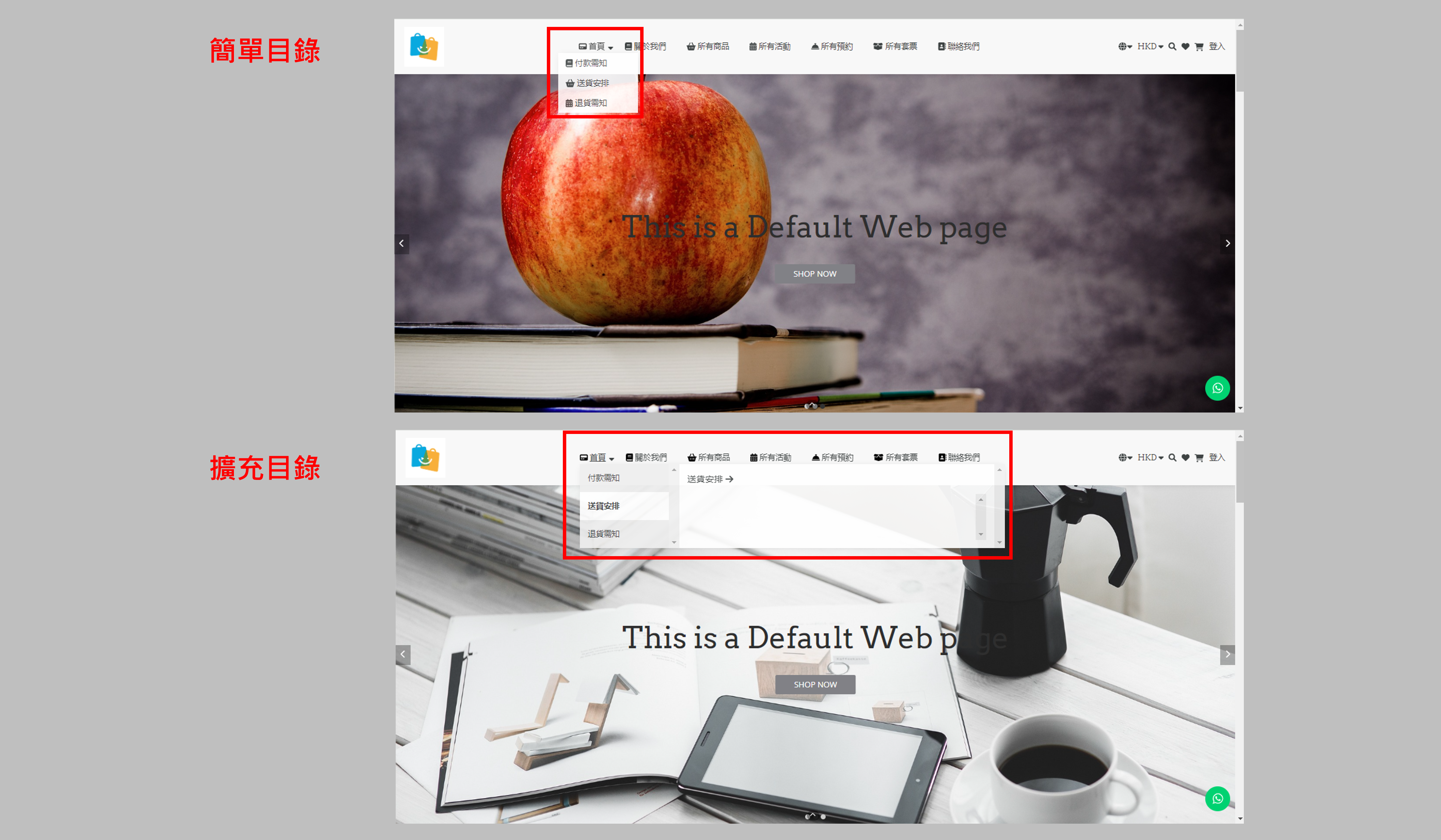 • 下拉式目錄:置頂選單上的目錄的分目錄的出現方式,可選「簡單目錄」或「擴充目錄」: